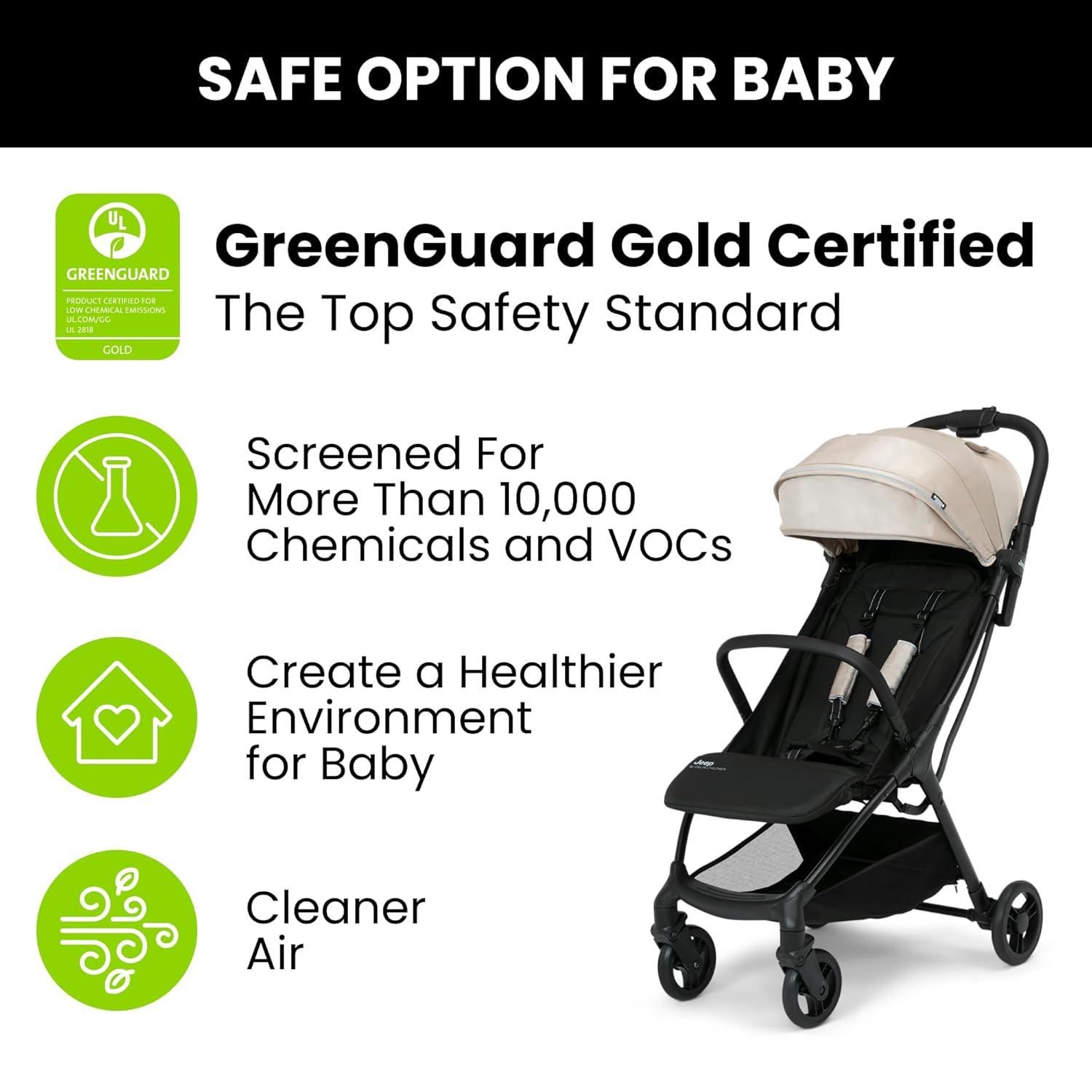 SAFE OPTION: GREENGUARD Gold Certified, this stroller contributes to healthier air quality around baby | JPMA certified; meets or exceeds ASTM and CPSC standards | 5-point safety harness with comfort shoulder pads