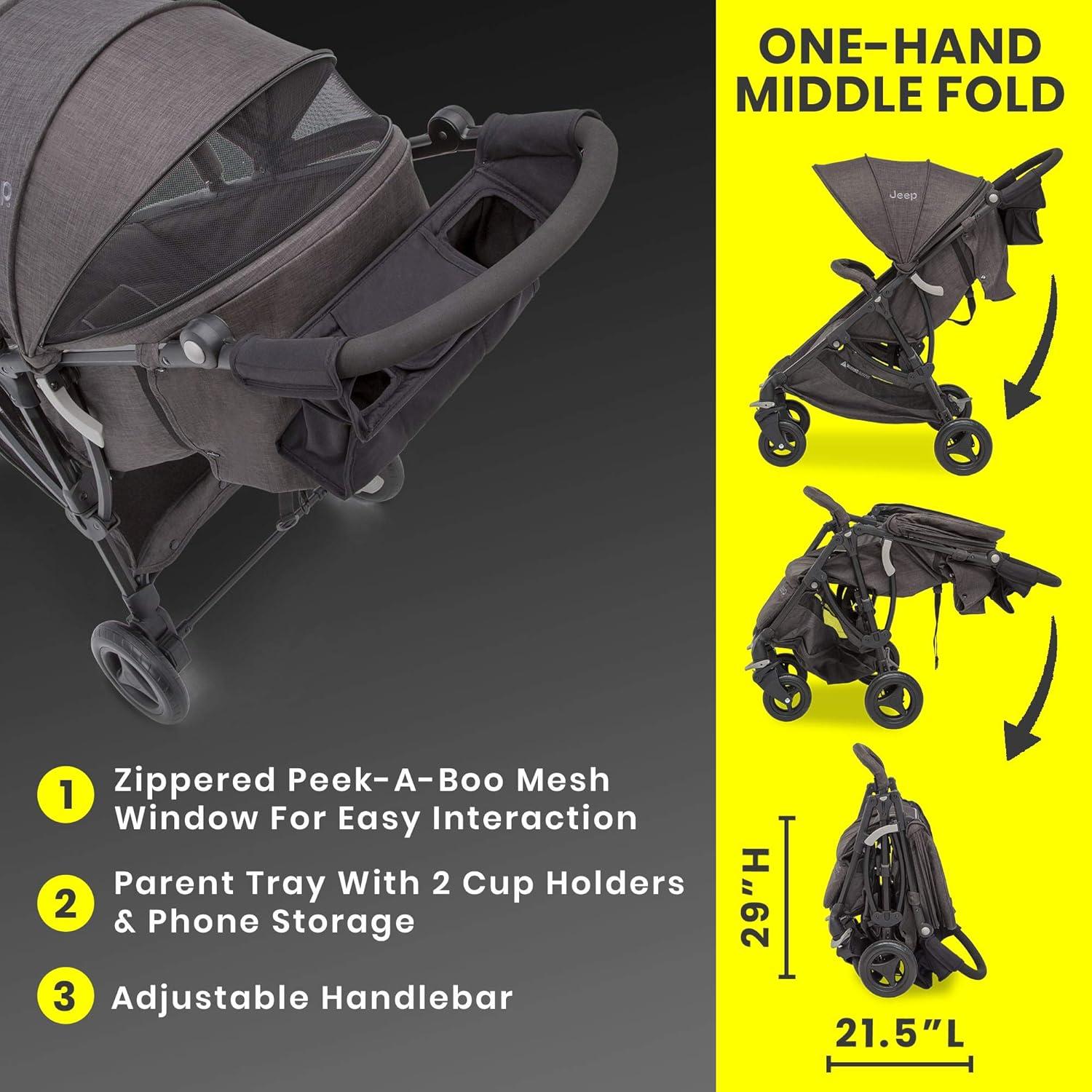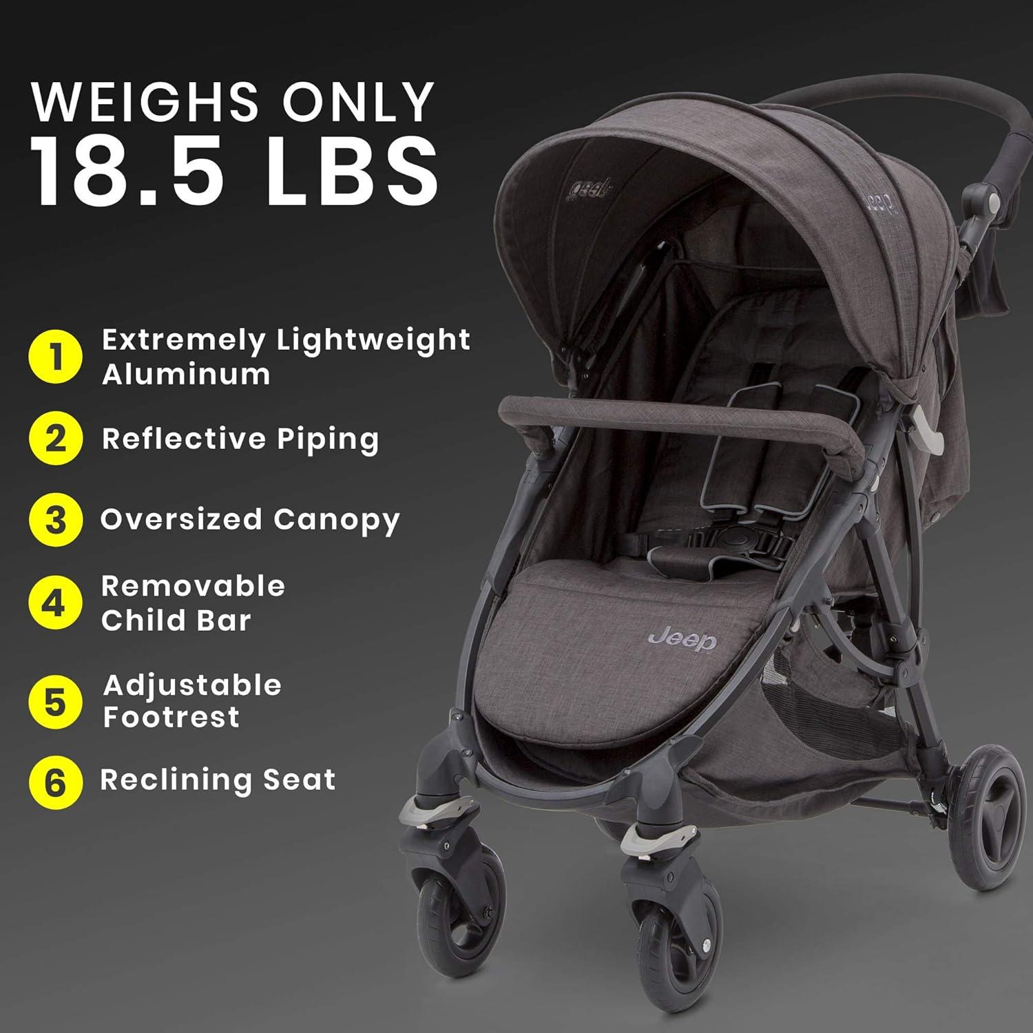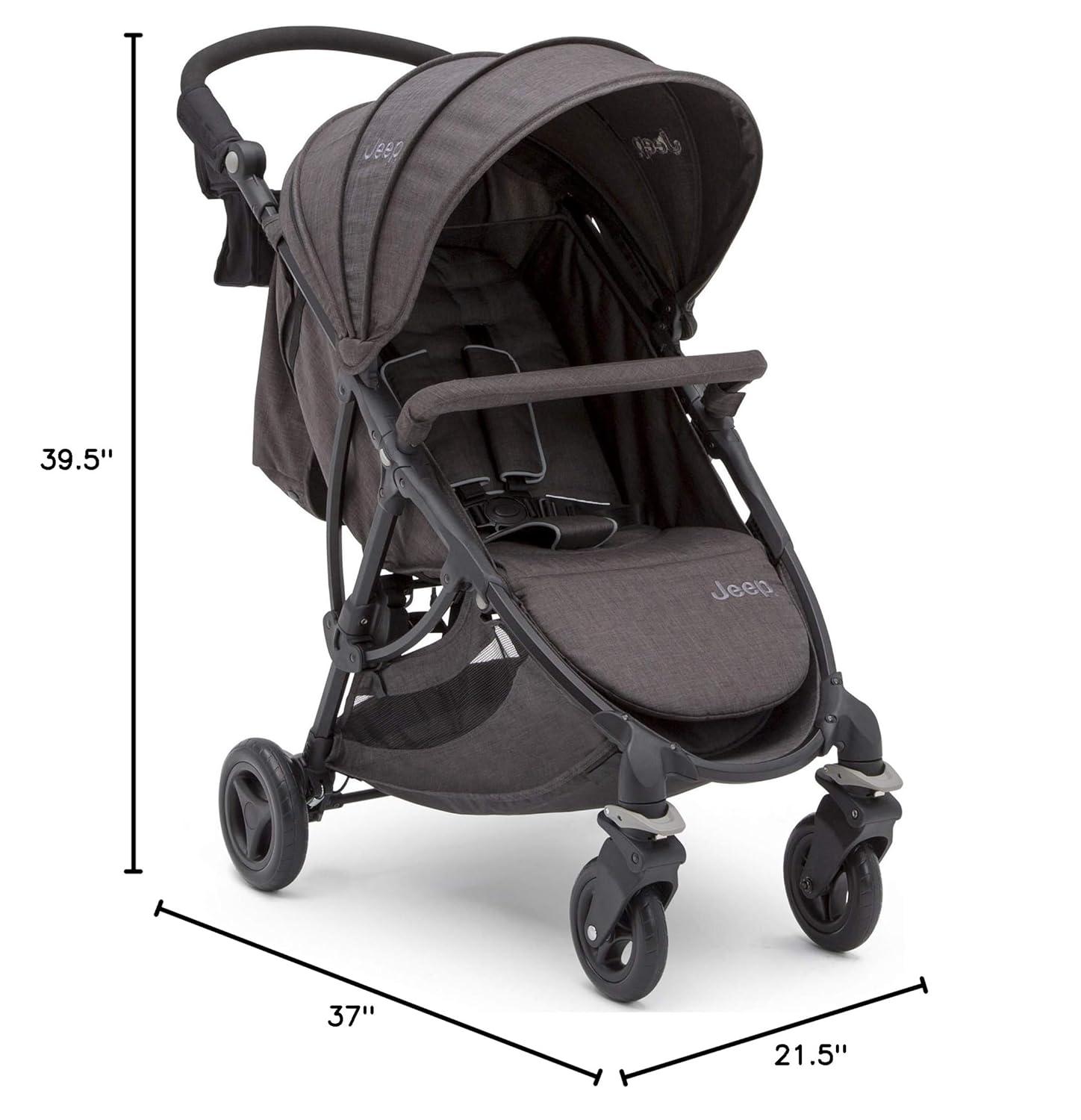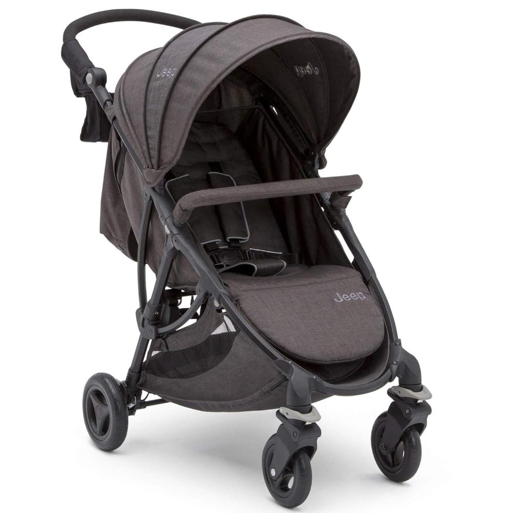 Lightweight, compact and adaptable, the Jeep Gemini stroller by Delta Children is the most versatile option for busy families. An extremely lightweight, all-in-one stroller, It weighs under 20 pounds and features a compact, one-hand fold that makes caring for baby and running errands easy-the auto-lock feature ensures the stroller stays folded during transport or while in storage. Easily convertible, the stroller's aluminum frame becomes an infant stroller in seconds, The car seat adapter (sold separately) works with the most popular car seats and creates a convenient travel system for your baby. As your child grows, the stroller's removable child bar, reclining seat, adjustable footrest and extendable canopy with zippered peek-a-boo mesh window accommodates their every need. For your comfort, adjust the foam handlebar to your ideal position, and keep all of your essentials within reach thanks to oversized storage bin and the handy parent storage tray that features two cup holders and covered storage for your phone, wallet or keys. Agile and effortless, front swivel lock wheels and back wheels with suspension and one-touch brakes make navigating busy streets and turning corners easy. Stroller holds up to 50 lbs. Since 1941, the Jeep brand has been a symbol of freedom and expression. Influenced by a love of the great outdoors, Jeep kids products are created for little adventurers.