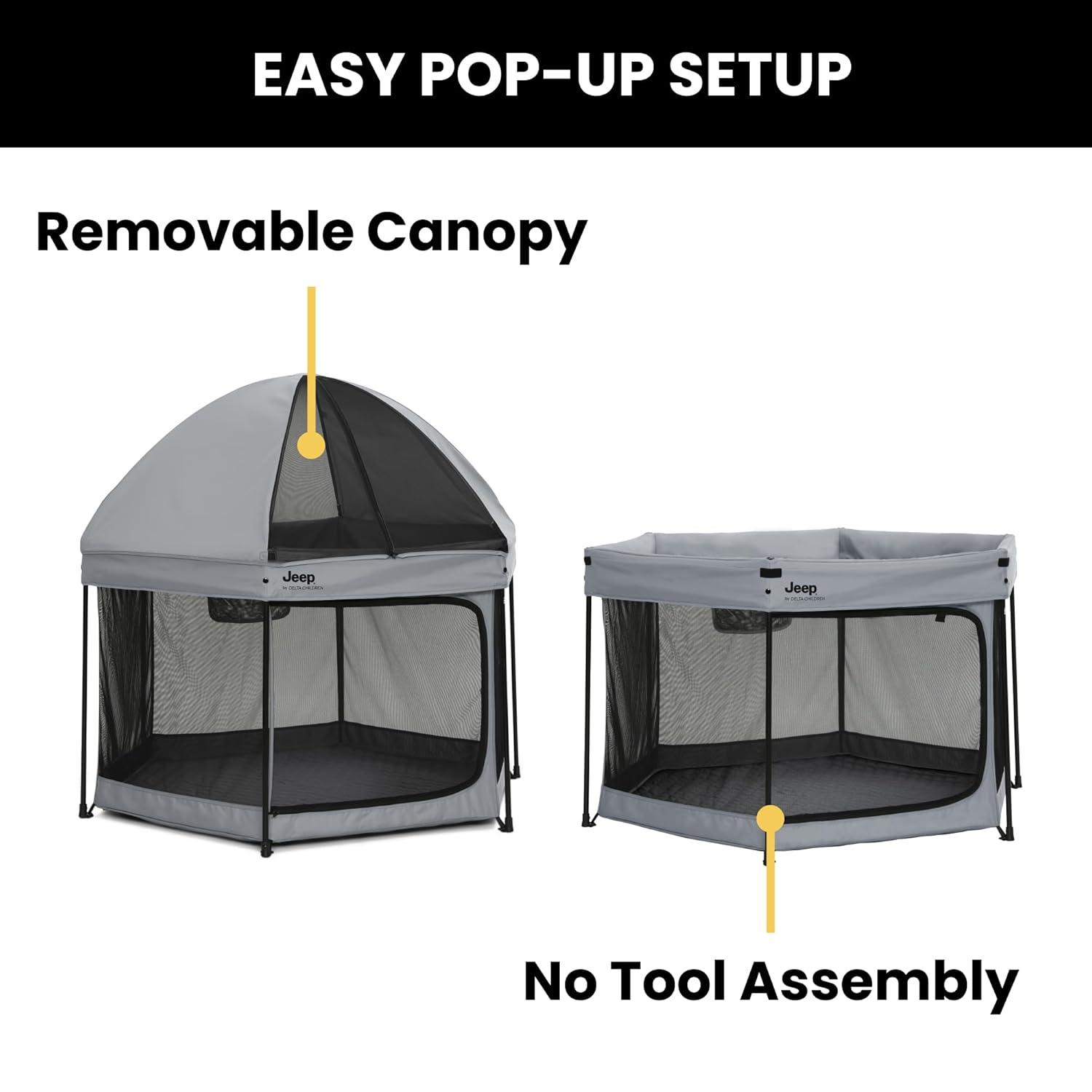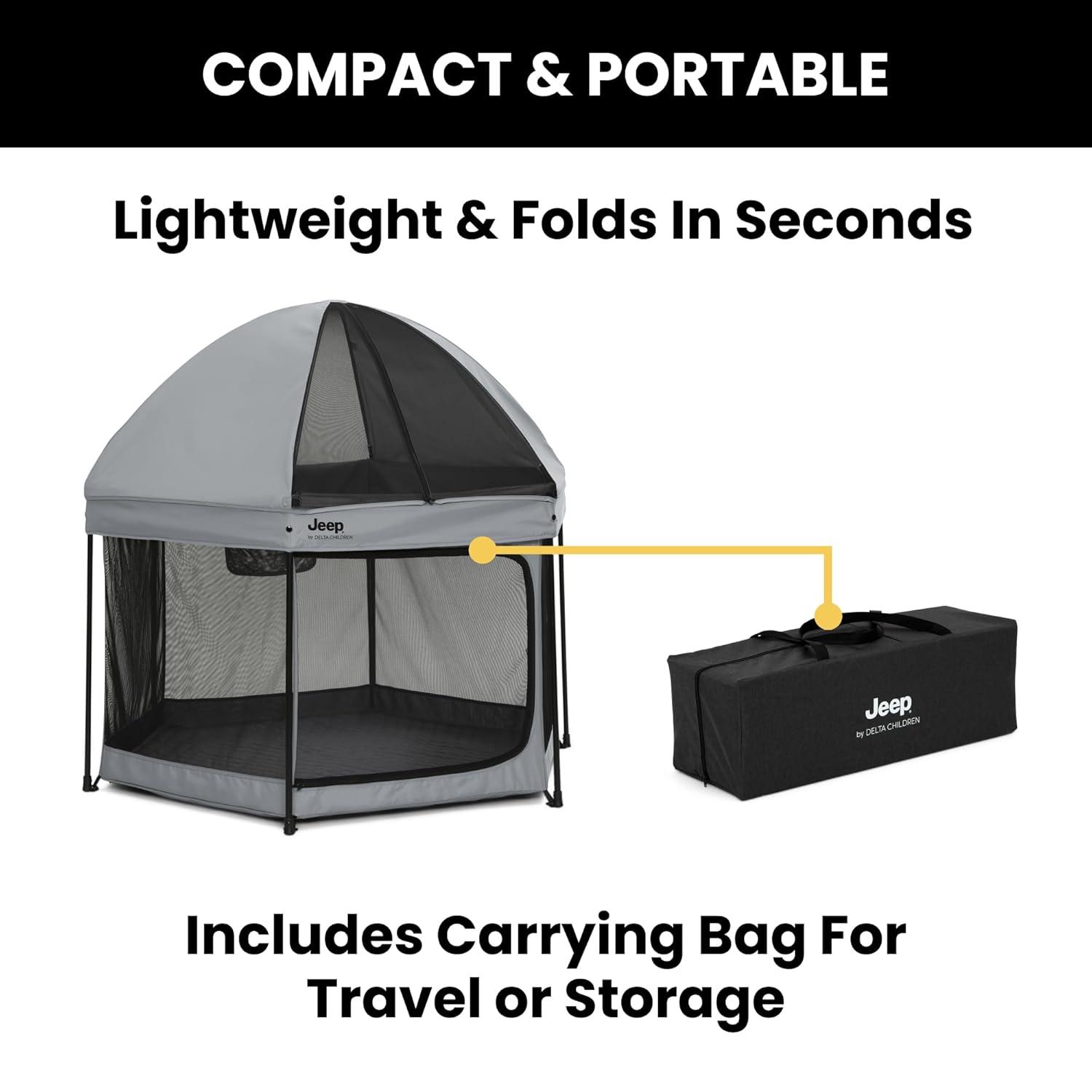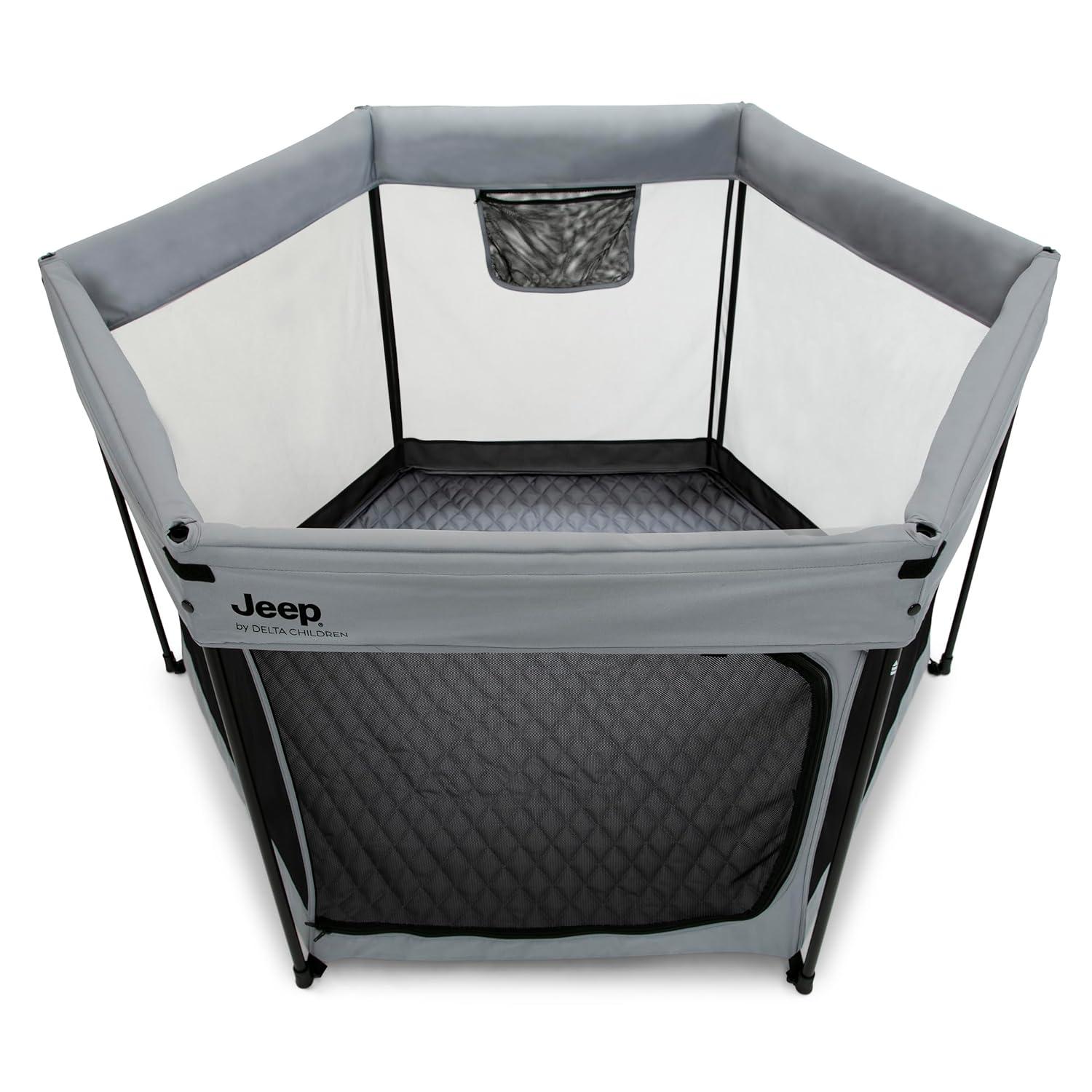 Adventure awaits with this Jeep Hexagon Pop Up Play Yard with Removable Canopy by Delta Children. A premium indoor and outdoor baby playpen, this play yard will be your baby’s portable haven of fun and safety! The lightweight, pop-up design allows you to set up or fold in seconds and the included carrying bag makes travel or storage easy. This portable, water-resistant play area keeps your child in a safe, nearby space whether at home or on the go. Even on a sunny day, the fully removable canopy offers protection from the sun by blocking harmful UVA/UVB rays with UPF 50+ protection. Airy mesh netting on all six sides allows for maximum ventilation and provides a clear view. Perfect for playtime on the go, use the Jeep Hexagon Pop Up Play Yard with Removable Canopy in the backyard, back country, beach or beyond.