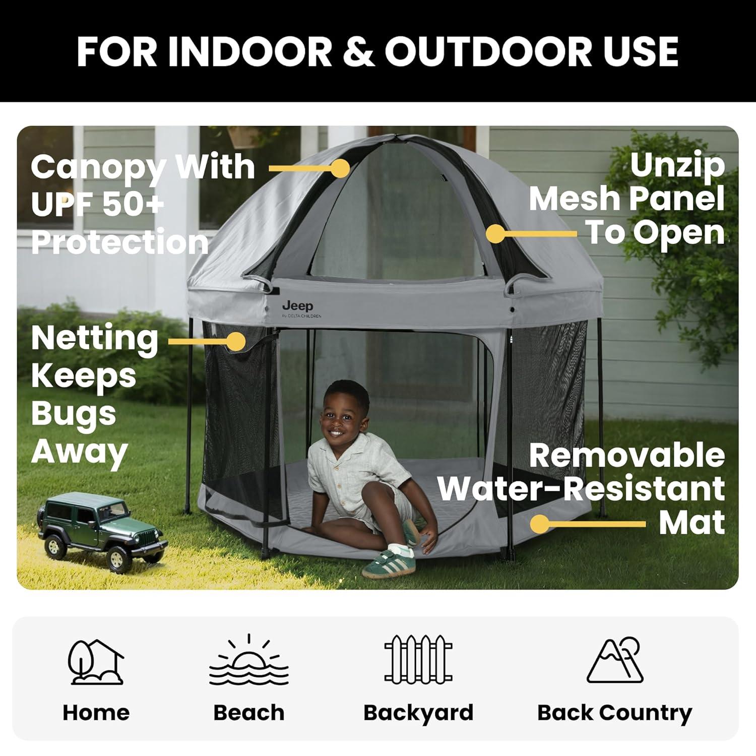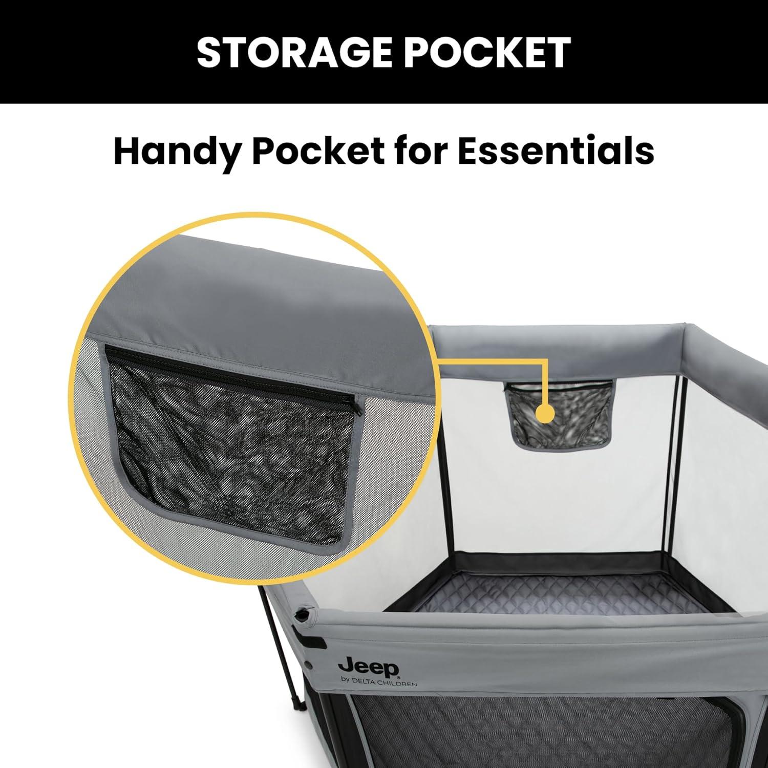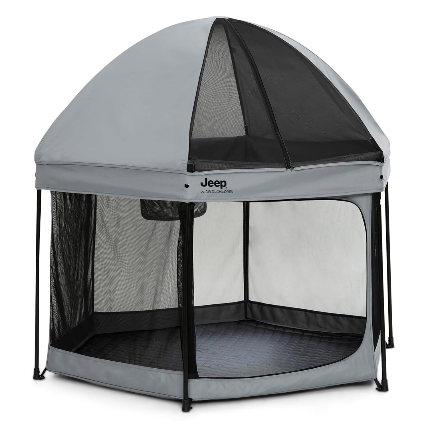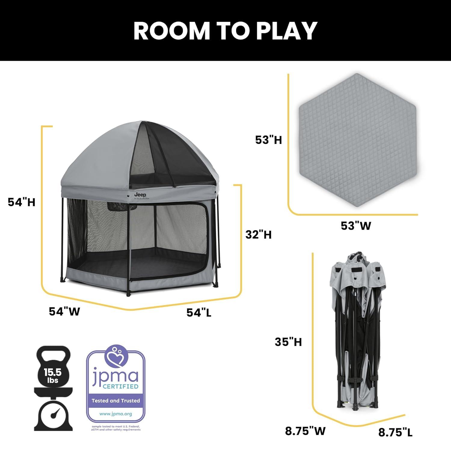 Adventure awaits with this Jeep Hexagon Pop Up Play Yard with Removable Canopy by Delta Children. A premium indoor and outdoor baby playpen, this play yard will be your baby’s portable haven of fun and safety! The lightweight, pop-up design allows you to set up or fold in seconds and the included carrying bag makes travel or storage easy. This portable, water-resistant play area keeps your child in a safe, nearby space whether at home or on the go. Even on a sunny day, the fully removable canopy offers protection from the sun by blocking harmful UVA/UVB rays with UPF 50+ protection. Airy mesh netting on all six sides allows for maximum ventilation and provides a clear view. Perfect for playtime on the go, use the Jeep Hexagon Pop Up Play Yard with Removable Canopy in the backyard, back country, beach or beyond.