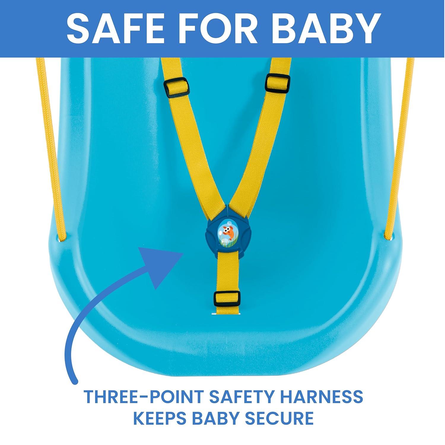 SAFE FOR BABY: Three-point safety harness keeps baby securely in place | Swing meets and/or exceeds ASTM safety standards