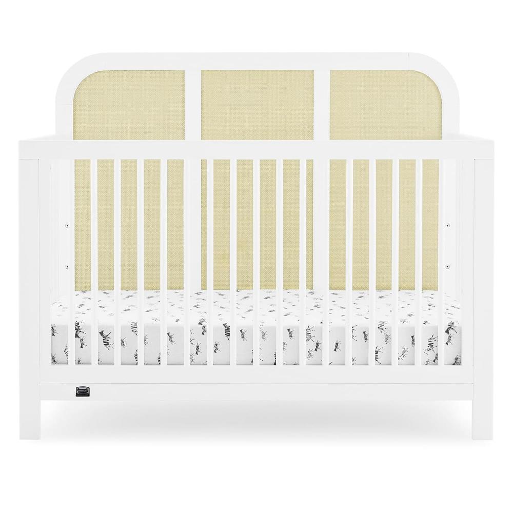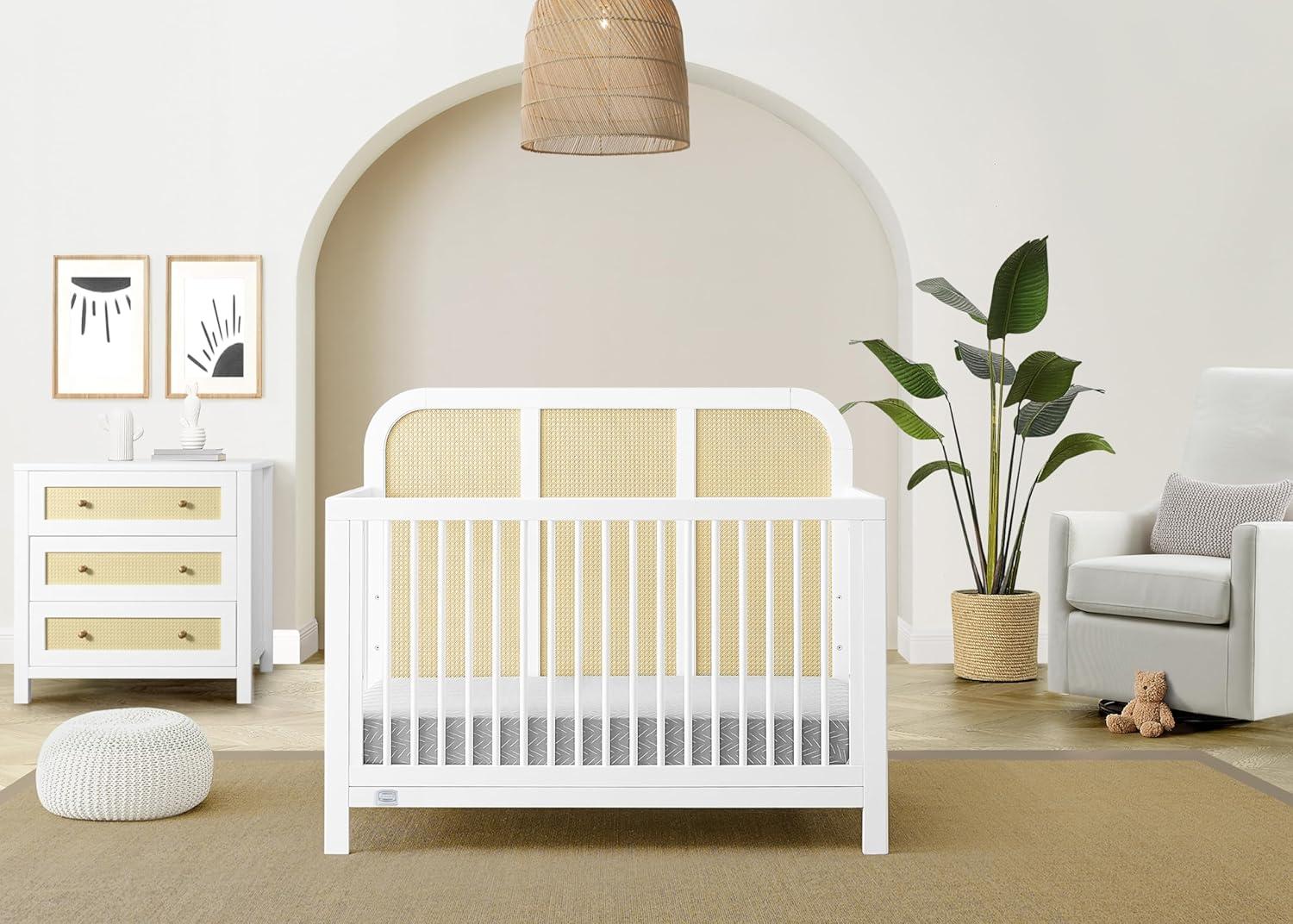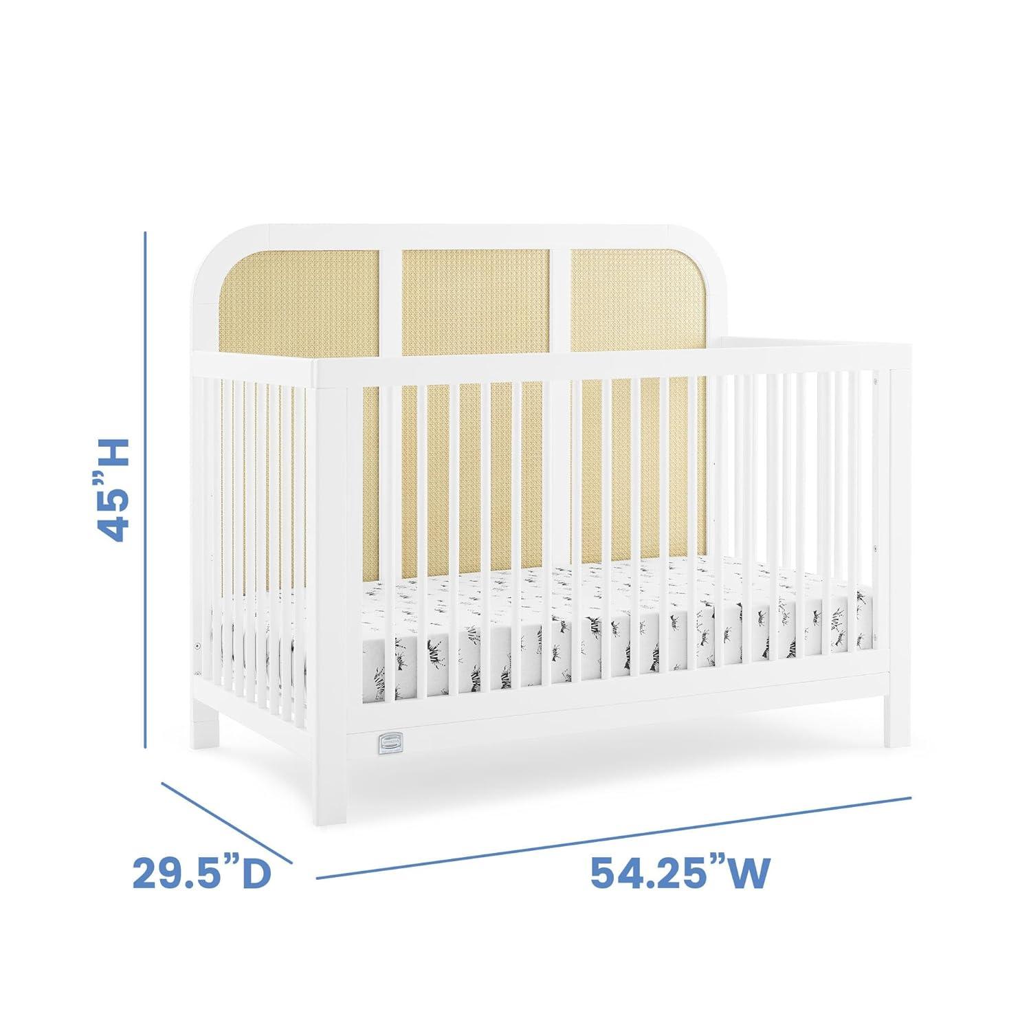 The Theo 6-in-1 Convertible Baby Crib by Simmons Kids gives a modern-meets-timeless feel with its tall headboard that features a subtle curve and three inset panels of airy natural-colored cane. Designed to be an on-trend focal point for your traditional, contemporary, coastal or bohemian nursery, this versatile crib will be the only bed your child ever needs. It has an adjustable height mattress support, so you can easily adjust it as your baby grows, just lower the mattress height as your child begins to sit or stand. This versatile crib can also be converted into a toddler bed, daybed, sofa and full-size bed with or without footboard (Daybed/Sofa Rail included, Toddler Guardrail #W100725 and Full Size Bed Rails #0050 sold separately). Plus, it’s GREENGUARD Gold Certified, which means it’s built to contribute to cleaner air for a healthy home. Available in Bianca White and Ebony. Pair this crib with the Theo 3 Drawer Dresser with Changing Top to complete your space.