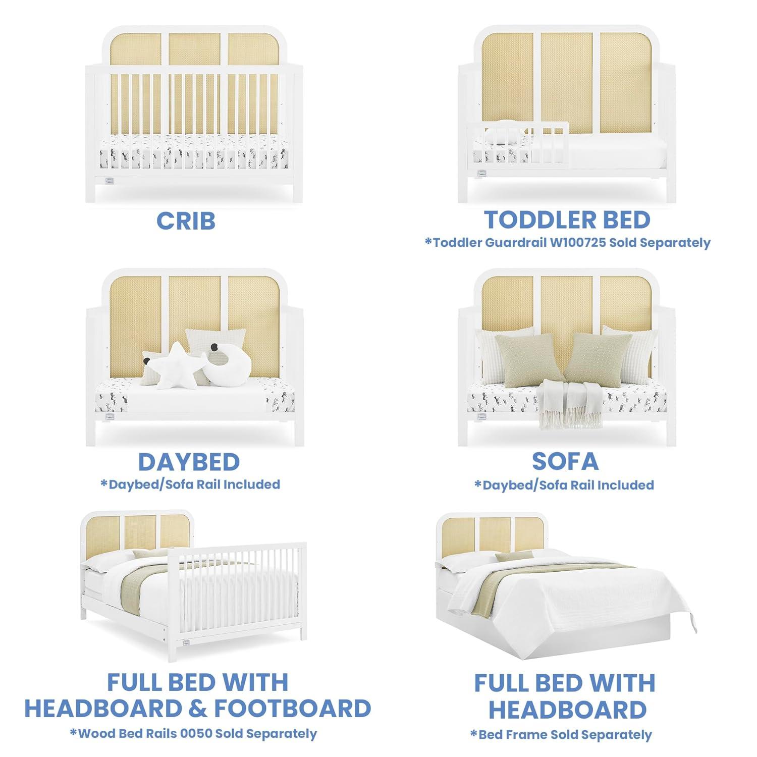 6-IN-1 CRIB: Crib converts to toddler bed, daybed, sofa, full size bed with headboard and footboard and full size bed with headboard only (Daybed/Sofa Rail included; Toddler Guardrail #W100725, Full Size Bed Rails #0050 sold separately)